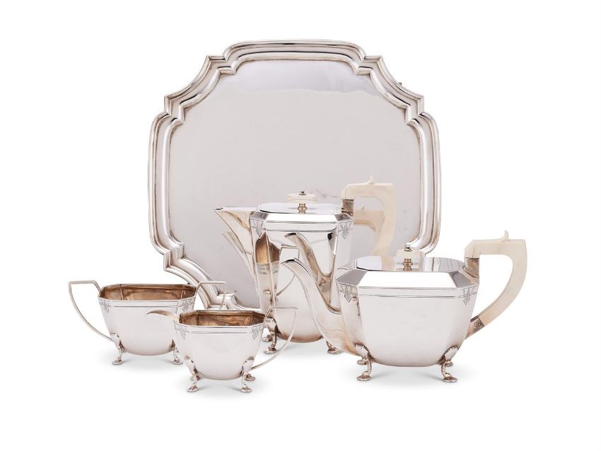 Y An Art Deco silver canted-rectangular four piece tea service on a salver by Viners, the service Sheffield 1941, the salver 1940, the tea and hot water pots with ivory finials and handles, geometric engraved upper angles, on canted pad feet, the tea pot 26cm (101/4in) long, the hot water pot 19.5cm (73/4in) high; the salver square with inset curved angles, on four scroll feet, 34cm (13 1/2in), 3056g (98.25 oz) grossCondition Report: Tea pot - Marks are clear, hinge and handle are tight, gap to the front of the cover, wobbles, splits to the ivoryHot water - Marks slightly rubbed, hinge good, play to the handle, gap to the front of the cover, splits to the ivory, wobblesSugar bowl - Mark's slightly rubbed, slightly rubbedCream jug - date letter rubbed, rest are clear, slightly wobblesSalver - Marks are clear, stands well, some heavier scratches to the surfaceLight scratches and wear commensurate with age and useCondition Report Disclaimer