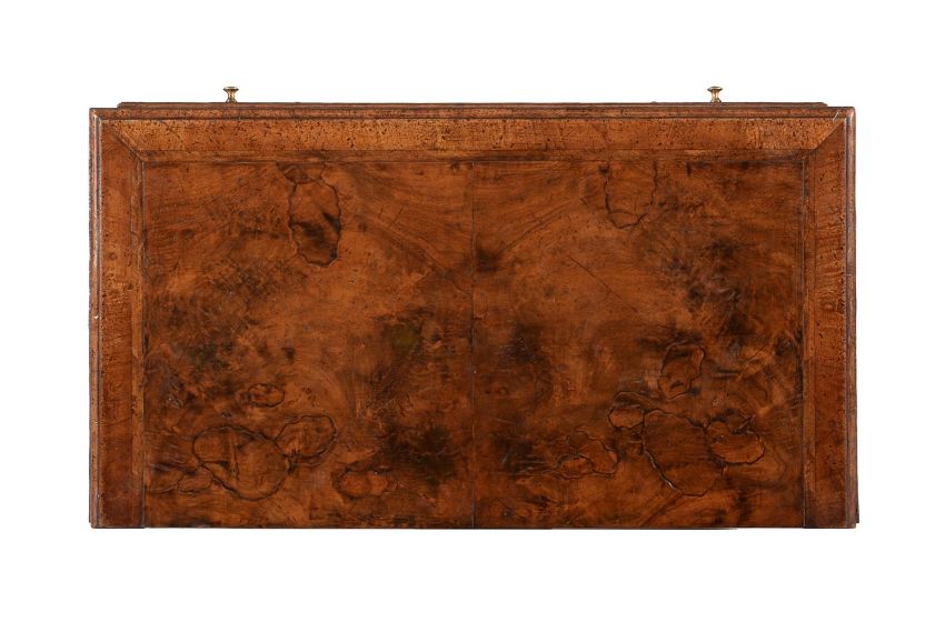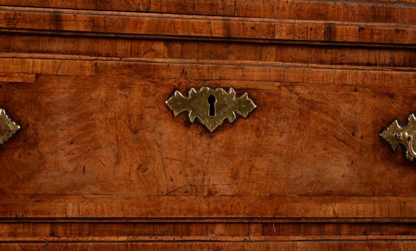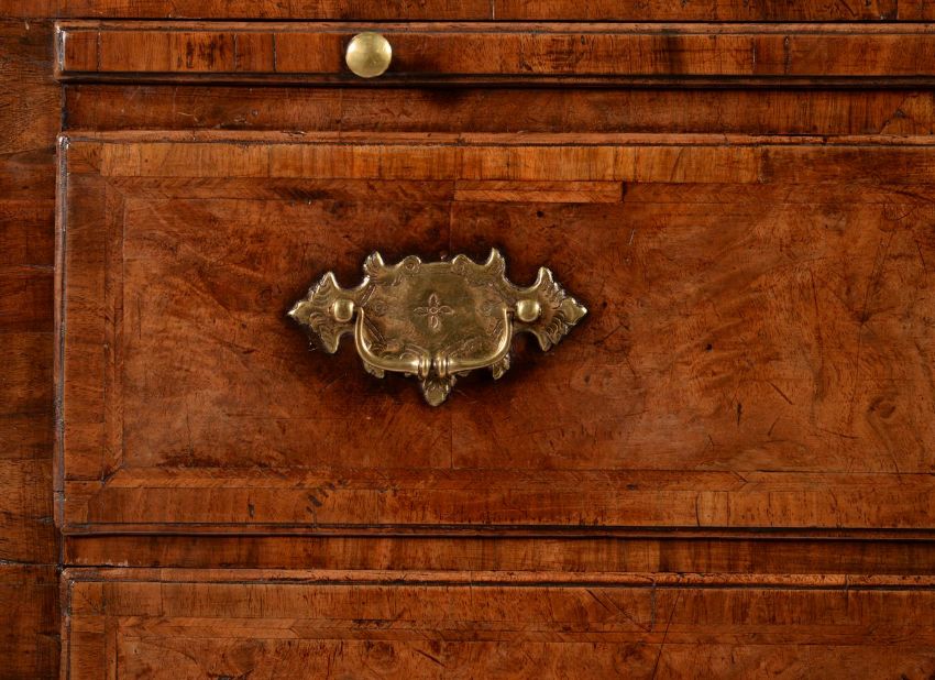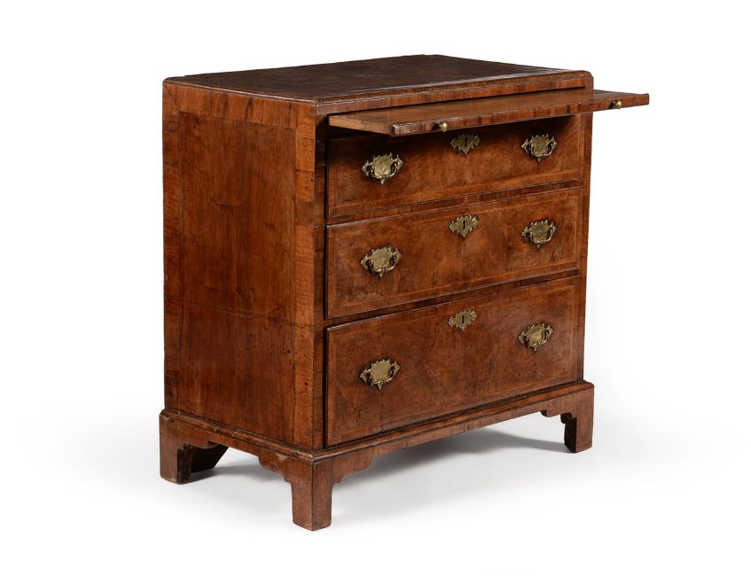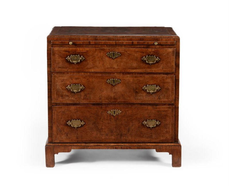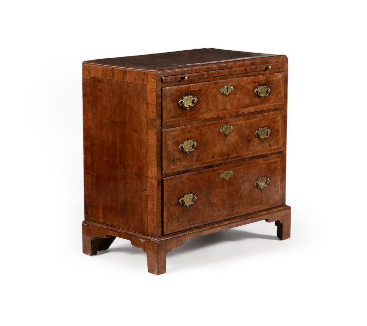 A GEORGE II WALNUT, FEATHER BANDED AND CROSS BANDED CHEST OF DRAWERS CIRCA 1735The caddie moulded top above a brushing slide 84cm high, 86cm wide, 47cm deep Please note, the date printed in the catalogue is incorrect and should read 'CIRCA 1735'  Condition Report: There are marks, scratches, chips, splits, abrasions consistent with age and use.The handles and escutcheons appear original. Some of the securing nuts to the reverse of the drawer fronts may be very old replacements. The locks appear original. The key present operates the locks but has almost certainly been later re-made in order to operate the locks for practical purposes. The rear panels appear original. There is one slender fillet of timber to one side of the rear panel that has age and likely dropped in to comensate for shrinkage. The feet are basically original but with some neat and well matched old veneer repairs. The block supporting one front foot from behind is likely an old replacement. Some other old supporting blocks may be old replacements. Some old repairs. There is evidence of old worm but minor overall and largely confined to the underlying blocks (see images) , the visible holes largely to the unveneered areas. The inclusion of a slide in a chest of this period is also unusual. The proportions and overall originality (considering all condition notes) is also quite rare for a piece of this period. Please refer to the additional images for a visual reference of condition. Condition Report Disclaimer