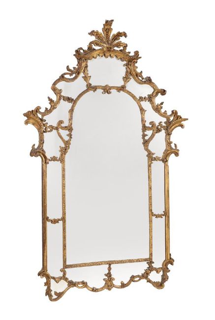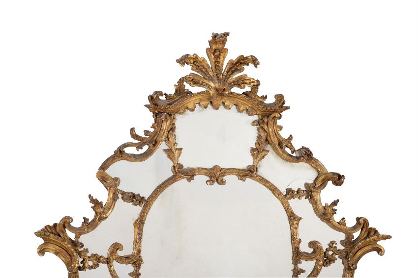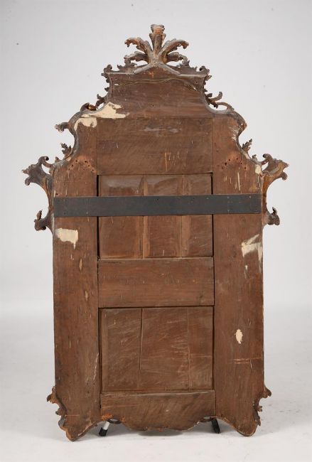 A LOUIS XV GILWOOD WALL MIRROR MID 18TH CENTURY 195cm high, 122cm wide Condition Report: Marks, knocks, scratches, wear and abrasions commensurate with age and use. Some old losses, Various old glued repairs. Some possible old elements of gilding refreshed but a considerable time ago . If this has been done in some areas it is highly sympathetically and overall the frame shows very good sign of the age/ originality. Some relatively small sections have likely been later gold painted to improve the appearance of repairs. The rear panels are original, there is also an addition single metal bracket screwed to the reverse of the mirror to secure/ strengthen. The surface with the expected rubbing, chips, cracks and some losses. One small shaped plate towards the upper right corner of the mirror has a single crack through it. Several of the plates may be replacements. It is difficult to conclude the age of them as several do not show obvious/ significant depletion. The central main mirror plate has age and some depletion in the form of small dark spots. The rear panel appears original. Please refer to additional images for visual reference to condition. Condition Report Disclaimer