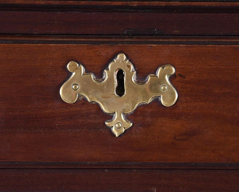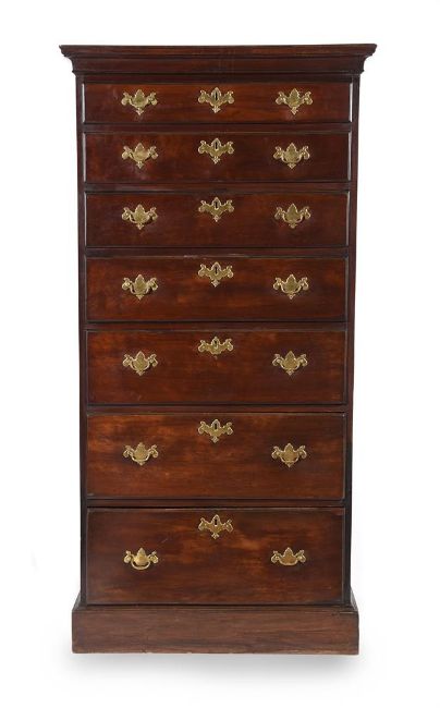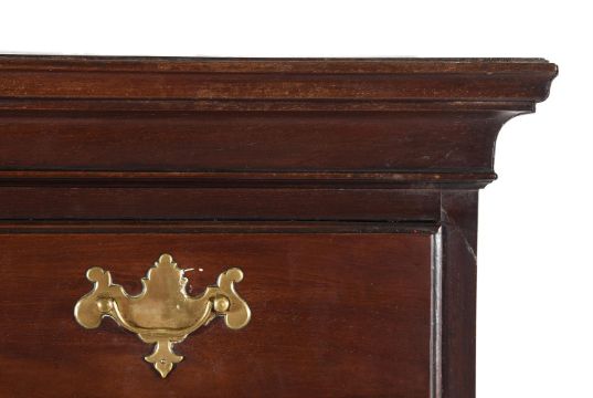 AN IRISH GEORGE II MAHOGANY CHEST OF DRAWERS CIRCA 1755156cm high, 75cm wide, 42cm deep Condition Report: Marks, knocks, scratches and abrasions commensurate with age and use. Old splits and chips. Later supporting blocks to underside of top. the undersides of the drawers with later runners. Evidence of old worm to the top, interior of carcass, drawer linings and underside. All metalware appears original. No key present, all locks are open. Later supporting blocks to underside/back of plinth base. Splits and opening to backboards with some strips of later tape applied. Old repairs, including to splits at sides and drawer fronts - see images for details. Two small sections of replacement timber inset to the gaps between drawer fronts. Some later nails securing mouldings. Please refer to additional images for visual reference to condition.   Condition Report Disclaimer