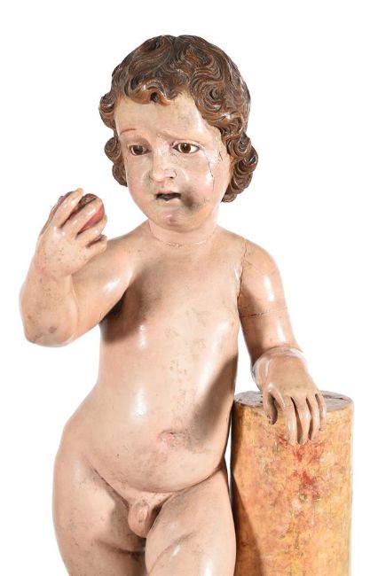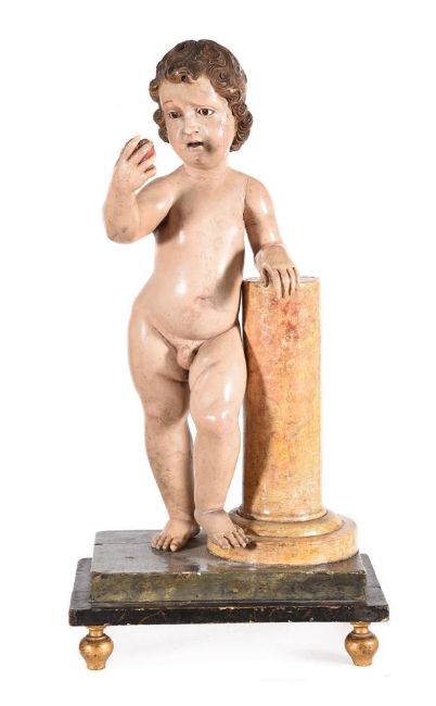 A POLYCHROME AND GILT PAINTED SOFTWOOD FIGURE OF A CHILD BEARING AN APPLEITALIAN OR SPANISH, 18TH CENTURYDepicted standing by a column, with inset glass eyes73.5cm high, 37.5cm wideCondition Report: There are marks, scratches, scuffs and abrasions consistent with age and use.The figure and base are of sectional construction with some of the joints visible where the gesso and paint has cracked over the underlying joints.The paintwork has cracks and is missing in some areas revealing the underlying gesso and wood. The figure is not quite securely fixed and has a later nail fixing the foot to the column; the column has some movement to it.Please see the additional photographs as a visual reference of condition.Condition Report Disclaimer
