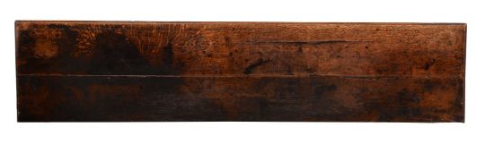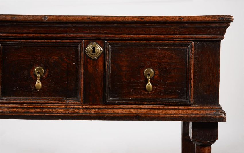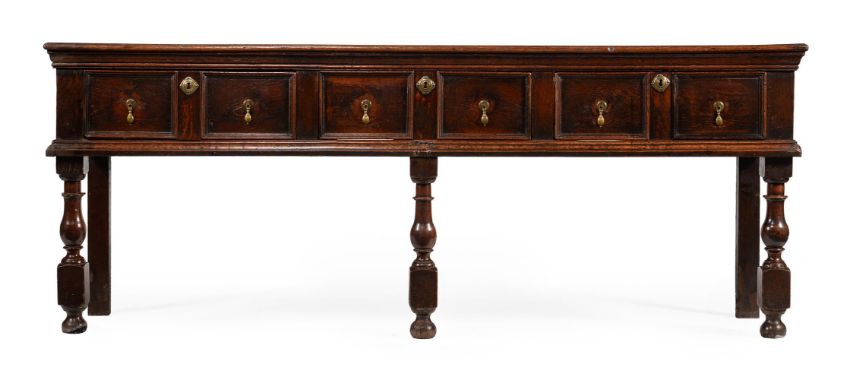 A CHARLES II OAK DRESSER BASE CIRCA 1670 82cm high, 208cm wide, 47cm deep Condition Report: Marks, knocks, scratches and abrasions commensurate with age and use. Various old chips, splits and losses. The rear edge of the top with two small sections of replacement timber to each corner. Later blocks to the underside of the top, glue residue and strips of hessian used to secure splits and joins between boards. Some later tacks/nails securing elements of moulding. Handles and escutcheons are later replacement but in period taste. The lock plate to one side drawer is possibly a later 18th century replacement. No key present but lock is open. Two drawers with their linings later replaced, using pine boards instead of oak. Both rear legs have been re-tipped. Evidence of old worm to interior of carcass and to drawer linings. Some later supporting elements to the interior of carcass. Some old filled holes to moulding above the central front leg where screw or dowel repairs have been made to help secure. One of the turned feet the front legs appears to be a later replacement. The other two have splits and losses consistent with age and use. Please refer to additional images for visual reference to condition.   Condition Report Disclaimer