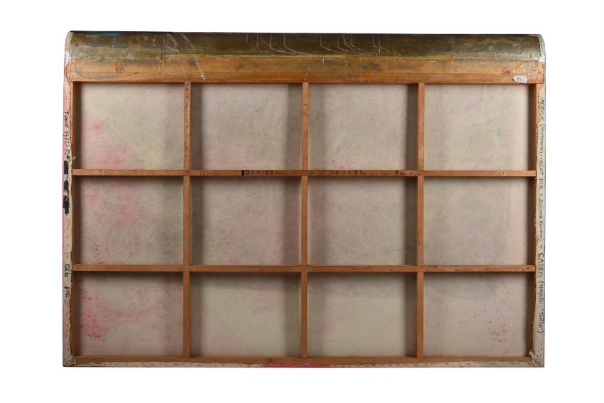 Acrylic and casein on canvas with wood roll top