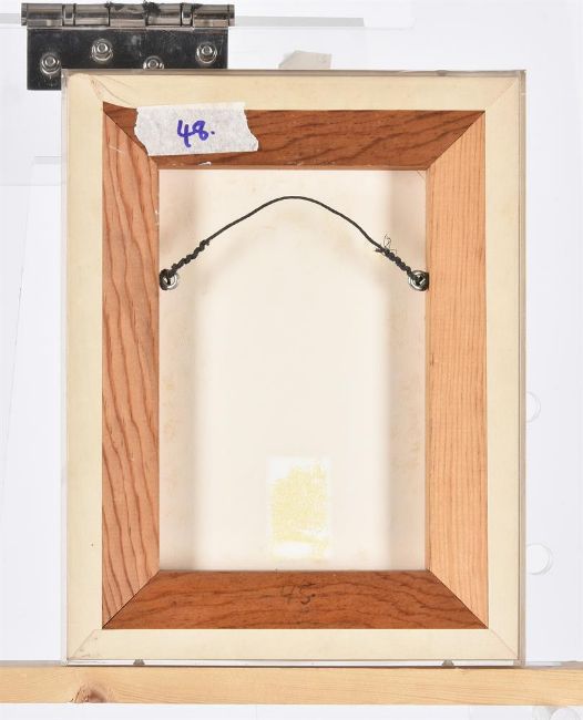 Under Perspex glaze. The work has faded and there is discolouration to the sheet. Otherwise in generally good original condition.