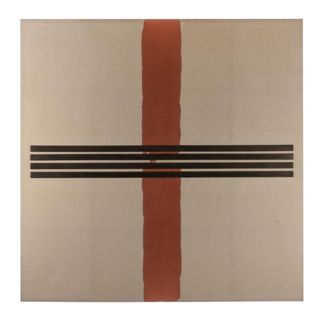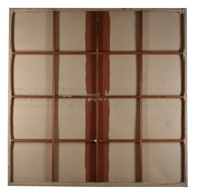 Very light stretcher mark visible to the edges. General surface dirt throughout. The work may benefit from a light clean. Two light dents in the top half of the work. Light surface scratch to the red pigment near the top edge. Black surface mark visible in the lower right quadrant. Otherwise in generally good original condition.