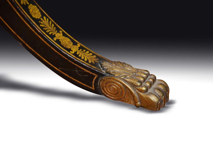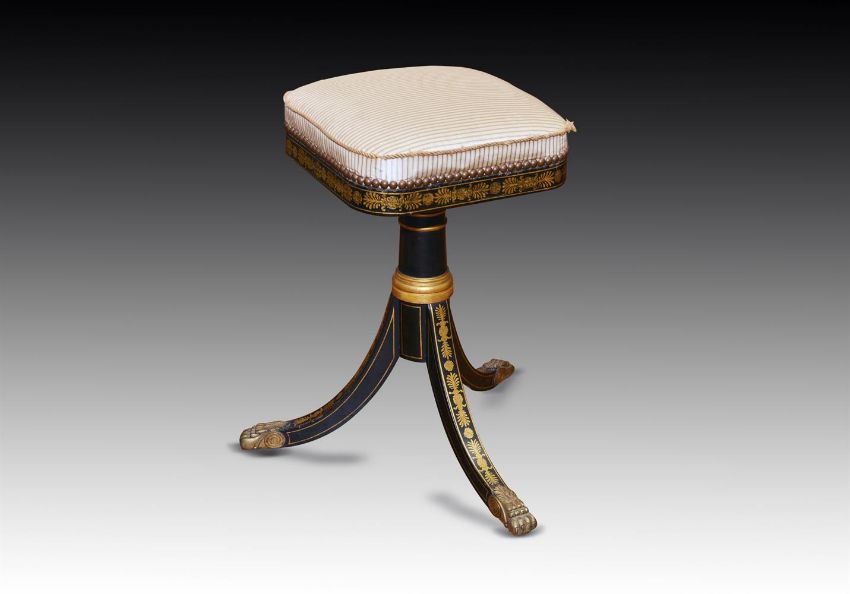 †  A REGENCY EBONISED AND PARCEL GILT PIANO STOOLCIRCA 1815, ERARD, LONDONBlack and gilt lacquered with trailing anthemion and paterae, the stuff-over seat on cylindrical column and tripod stand with gilt metal paw feet49cm high minimum, 32cm wideCatalogue Note:A similar model of a piano stool dating from 1818 and by Erard is held in the National Trust's collection at Attingham Park, Shropshire. In The Pictorial Dictionary of Marked London Furniture 1700-1840, Christopher Gilbert notes the firm of Erard were active in London from 1786-1837 as maker of pianofortes and associated furniture. The firm was founded by Sebastian Erard and he left it to his nephew Pierre in 1815. Examples of their music stands are illustrated in figures 324-327.攝政時期的黑色包裹鍍金鋼琴凳約1815, 艾拉爾, 倫敦黑色鎏金,帶有尾菊、蕨,柱上加厚軟墊座,金屬鎏金腳掌架最低49cm, 寬32cm目錄注解: 一個類似的鋼琴凳模型可以追溯到1818年,由Erard製作,在什羅普郡的Attingham公園被國民託管組織收藏。克里斯多夫·吉伯特在《1700-1840年有標記的倫敦傢俱畫冊詞典》中提到,Erard公司在1786-1837年間活躍於倫敦,主要生產鋼琴和相關傢俱。  † indicates that VAT is payable by the purchaser at the standard rate of 20% on the hammer price as well as being charged on the buyers' premium.Condition Report: Wear and staining to silk. Some rope border missing. Overall condition consistent with ageCondition Report Disclaimer
