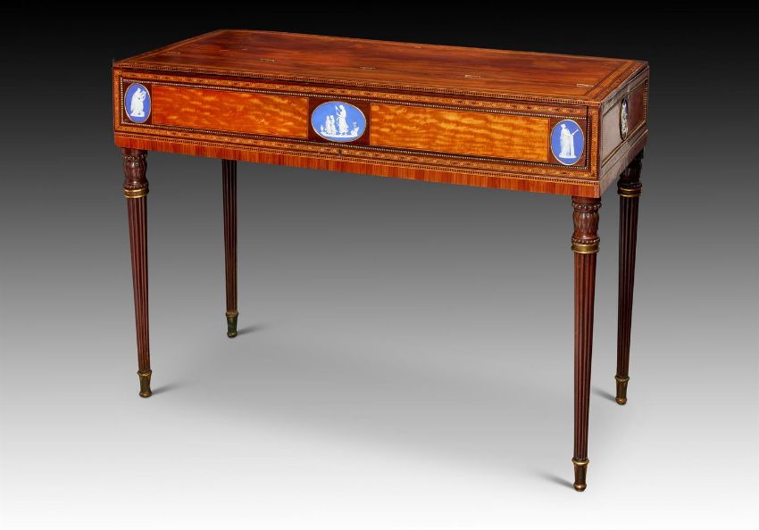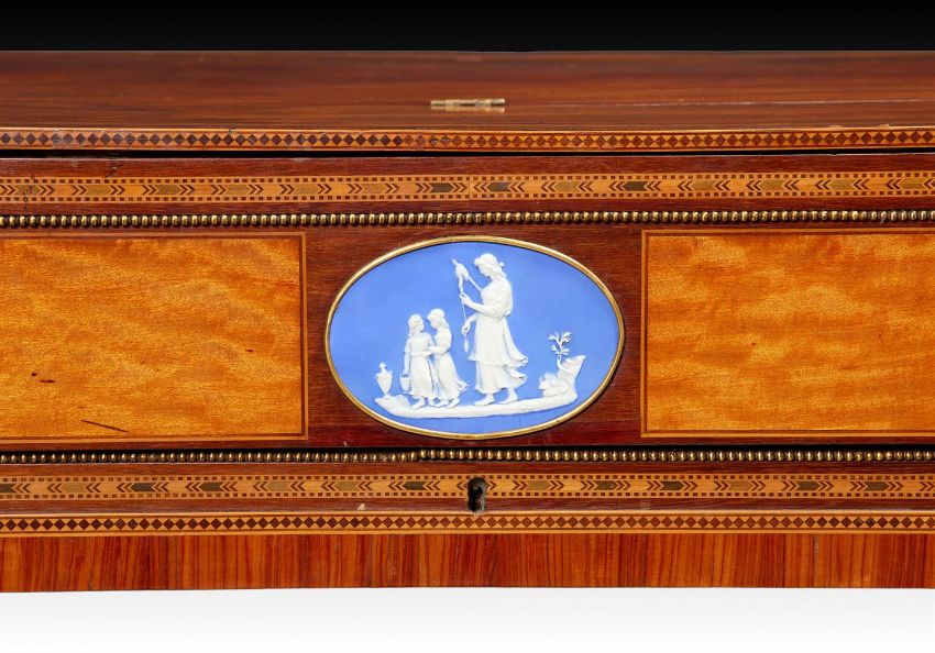 Y†  AN ENGLISH SQUARE PIANO CIRCA 1795 Possibly by Clementi, the satinwood and Kingwood crossbanded case inlaid with marquetry banding and brass beading and inset with Wedgwood blue jasperware plaques depicting classical figures, on fluted tapered legs with ormolu mounts, the 4 ½ octaves action with two hand levers controlling dampers and buff stops, with original green silk dust cover110cm wide, 50cm deep, 80cm highCatalogue Note:This beautiful little piano, only 42 ¾ " by 19 ½" was most likely a special commission or exhibition instrument. The 7 inset Wedgwood plaques are of the highest quality and are set-off the fine case. The Wedgwood pale-blue Jasper plaques sprigged with white ornament: The nation's greatest potter, Josiah Wedgwood's (1730-95) working life coincided with the 18th century's great love of all things 'Antique'. The splendours of Pompeii and Herculaneum were discovered in this century and the great 18th century Scottish architect Robert Adam had the ruins of the Emperor Diocletian's Palace in Split surveyed in the 1760s. In the ancient world, much extravagant ornament, embellishments for furniture and elaborate vessels were made from polished stones or glass so Wedgwood developed a variety of dry stoneware bodies that could be worked and polished in the lapidary manner to resemble jaspers, basalts, marbles etc. of the type that was being excavated all over the Greaco-Roman world. Wedgwood commissioned work from many of the best designers and artists of the day and collaborated with other manufacturers such as Matthew Boulton and architects like Robert Adam. 'Domestic Employment', seen here on the central medallion of the piano, was realized by his modeller William Hackwood after designs by Elizabeth, Lady Templetown from her cut paper patterns. The Potteries Museum and Art Gallery in Stoke on Trent has confirmed such attribution. In addition to Lady Templetown, Wedgwood used the designs of two other talented amateur female artists for designs for the new Jasper body perfected in 1776, namely Lady Diana Beauclerk and Miss Emma Crewe. It may seem unusual for the period for Wedgwood to commission female artists, but for the potter and his business partner Bentley, patronage of fashionable people, be they male or female, made perfect commercial sense. 英式方形鋼琴 約1795可能是通過克萊門蒂,緞木和黃檀樹交叉頻帶的琴箱,鑲嵌著細工鑲嵌條帶和黃銅卷邊,嵌入插圖韋奇伍德藍色浮雕玉石匾牌描繪著古典人物,加上鍍金支架槽錐形腿,4½八度擊弦機帶有兩個手杠杆控制減緩器和緩衝停止,加上原來的綠色絲綢防塵罩寬110cm, 深50cm, 高80cm目錄注解: 這架漂亮的小鋼琴,只有42又3 / 4英寸長,19½英寸寬,很可能是一個特別委託或展覽樂器。7個鑲嵌的韋奇伍德牌匾擁有最高品質,突出的精細琴箱。 韋奇伍德淡藍色的碧玉牌匾上點綴著白色裝飾: 英國最偉大的陶工喬賽亞·韋奇伍德(1730-1995年)的職業生涯與18世紀對 "古董"的熱愛不期而遇。龐貝和赫庫蘭尼姆的輝煌在本世紀被發現,18世紀偉大的蘇格蘭建築師羅伯特·亞當在18世紀60年代對位於斯普利特的戴克裡先皇帝宮殿的廢墟進行了勘察。在古代,很多奢侈的裝飾品,傢俱和精緻的器皿都是由拋光的石頭或玻璃製成的,所以韋奇伍德開發了各種乾燥的炻器,可以用寶石的方式加工和拋光,類似碧玉,玄武岩,古希臘羅馬世界各地都在挖掘的大理石等。 韋奇伍德委託當時許多最優秀的設計師和藝術家進行設計,並與其他製造商合作,如馬修博爾頓和羅伯特亞當等建築師。這架鋼琴的中央大獎章上的"Domestic Employment"是由他的模特威廉·哈克伍德根據伊莉莎白·坦普爾頓夫人的剪紙圖案設計出來的。除了鄧普頓夫人之外,韋奇伍德還使用了另外兩位才華橫溢的業餘女性藝術家的設計,他們是戴安娜·博克拉克夫人和艾瑪·克魯小姐,在1776年為賈斯珀設計了完美的新身體。在那個時期,韋奇伍德委託女性藝術家似乎是不尋常的,但對陶工和他的商業夥伴賓利來說,贊助時尚人士,無論是男性還是女性,都具有完美的商業意義 Y indicates that this lot may be subject to CITES regulations when exported. Relevant CITES Regulations may be found at www.gov.uk/guidance/cites-imports-and-exports. The import of ivory is banned in certain countries. Please check your country's import regulations before bidding.† indicates that VAT is payable by the purchaser at the standard rate of 20% on the hammer price as well as being charged on the buyers' premium.Condition Report: Case has been repolished at some time in the past. Wedgwood plaques restored. Instrument requires minimal musical restoration. Condition Report Disclaimer