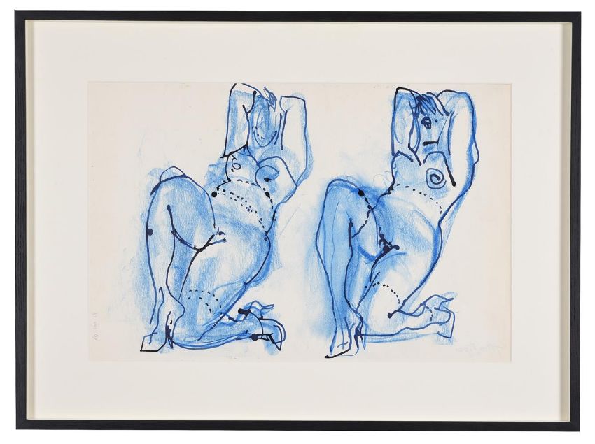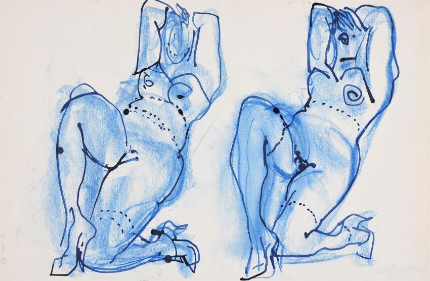 λ John Piper (British 1903-1992)Two blue nudesCrayon and inkDated 31 viii 67 (lower right); with the block-stamped signature 'John Piper JECP' (verso)53.5 x 36cm (21 x 14 in.)
