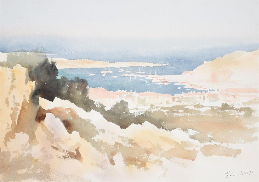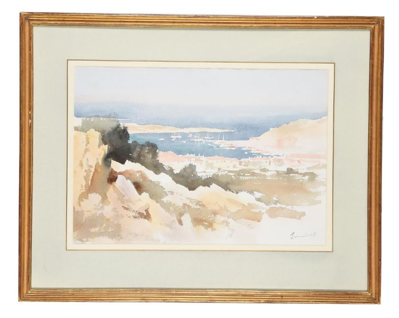 λ Edward Seago (British 1910-1974)View of Porto ServoWatercolourStamped with signature (lower right)36 x 53cm (14 x 20¾ in.)Provenance: The Estate of the Artist (label attached verso)Spink, London, No. K2 5386/46