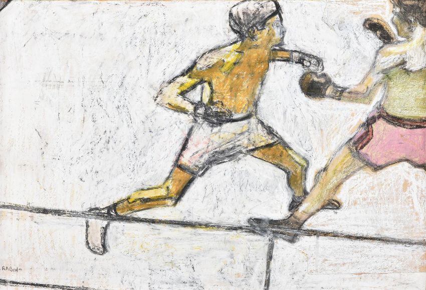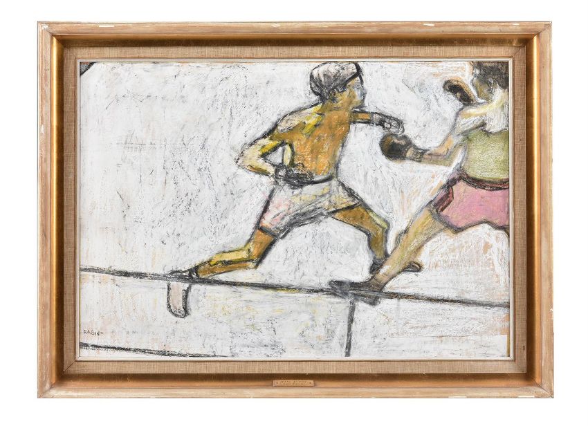 λ Sam Rabin (British 1903-1991) The Main EventMixed media on paperSigned (lower left)53 x 76cm (20¾ x 29¾ in.)Provenance: From the collection of The Hon. Sir William McAlpineSam Rabin (British 1903-1991) was born in Manchester to Jewish-Russian exiles from Vitebsk. Rabin was truly versatile in his practice: a skilled artist, sculptor, teacher and athlete. He won a scholarship to the Manchester Municipal School of Art in 1914, at age 11 - the youngest person ever to attend the prestigious school under French artist Adolphe Valette. His formal education continued at the Slade School of Fine Art in London, under Henry Tonks. In 1925 he moved to Paris, where he met and was greatly influenced by Charles Despiau. In parallel, he competed as an amateur wrestler and boxer - becoming part of the Great Britain squad for the 1928 Olympic Games in Amsterdam, and winning a bronze medal. Rabin worked as a sculptor in London on the Daily Telegraph building and London Transport headquarters, but despite this early success he was wasn't able to find a stable source of work. He funded his artistic career through professional wrestling during the 1930s. Later, Rabin went on to teach drawing at Goldsmith's College of Art, Bournemouth College of Art, and the Poole Art Centre. His students included Mary Quant, Bridget Riley and Tom Keating.Condition Report: Executed on a number of torn and joined sheets. Some lifting to the joined sheet edges at the right half of the composition. The sheet is undulating slightly in the frame and there are some scattered losses to the paint and some lines of cracking upper right. There is a piece of old yellowed tape visible at the lower right corner. The work would benefit from being glazed.Condition Report Disclaimer