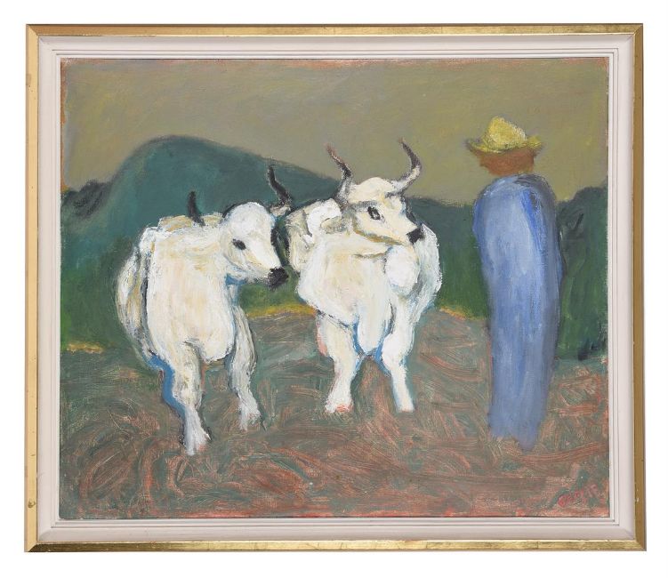 λ Henryk Gotlib (Polish 1890-1966)Oxen and Farmer Oil on canvas Signed (lower right)63 x 76cm (24¾ x 29¾ in.)Condition Report: Canvas slightly slack. A couple of small spots of surface dirt and some minor light craquelure to the impasto in the white pigment on the oxen. Inspection under UV reveals no obvious evidence of retouching or repair. Condition Report Disclaimer