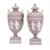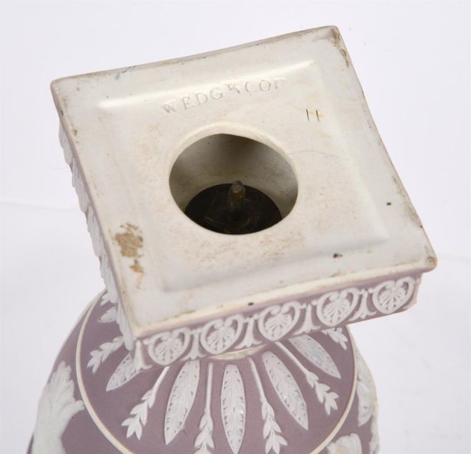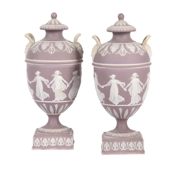 A pair of Wedgwood lilac-dip Jasper two handled urns and covers, late 19th century, typically sprigged in white with Neo-Classical ornament, 20cm highProvenance: Charles Lumb, Harrogate, November 1972 (£375). Condition Report: Both handles and both covers restored. The restoration is a little yellowed and has probably run its course.Condition Report Disclaimer