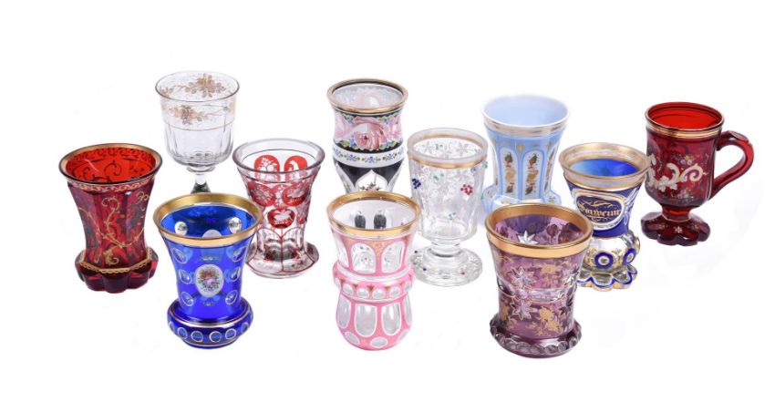 A group of nine Bohemian coloured glass beakers, a ruby flashed mug and a clear and gilt glass goblet, third quarter 19th century and later, 16.5cm high and smallerCondition Report: Slight wear to the gilding generally, and two of the beakers with chipsCondition Report Disclaimer