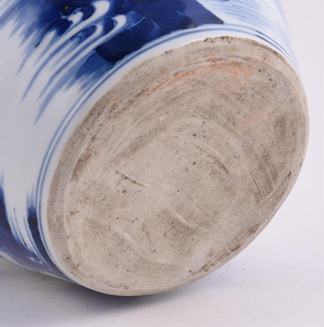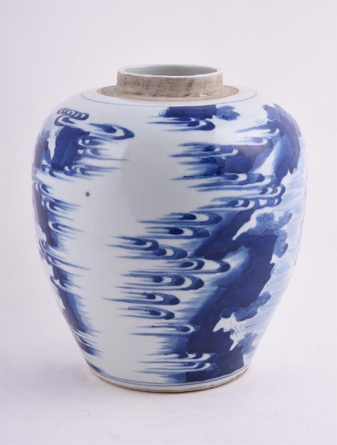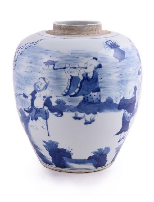 A Chinese blue and white jar, perhaps late Qing, painted with mythical figures, 26cm high Condition Report: good condition Condition Report Disclaimer