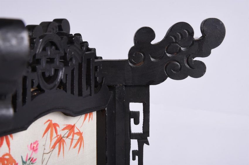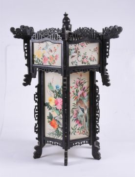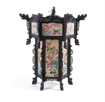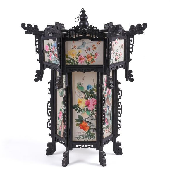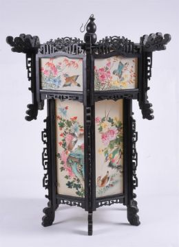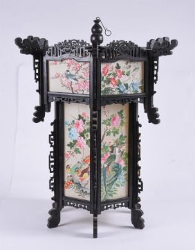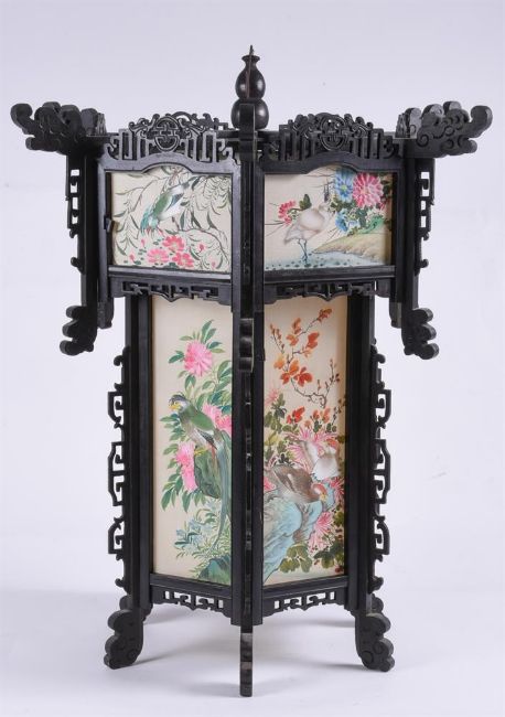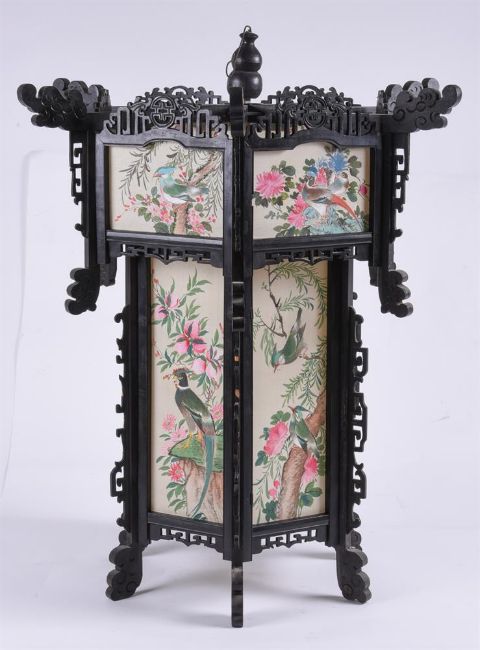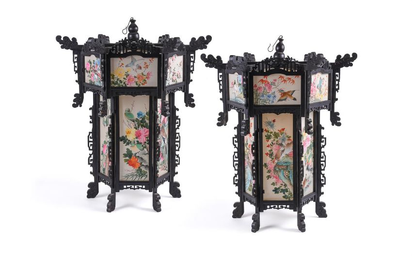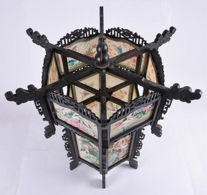 A large pair of Chinese wood and painted silk hanging lanterns, 1950's, of hexagonal shape, approximately 74cm high x 61cm wide (2)Provenance: From the descendants of Iskander Ali Mirza, the first President of Pakistan. Condition Report: some losses to wood fretwork but silk panels in good bright condition Condition Report Disclaimer