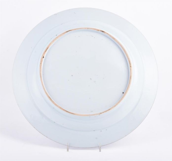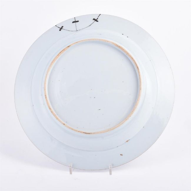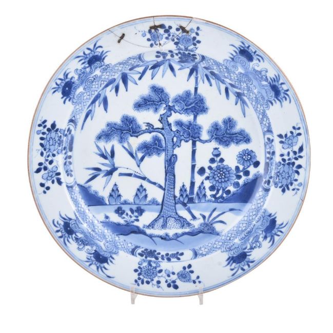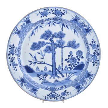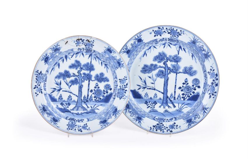 Two Chinese blue and white dishes, Kangxi, with pine, bamboo and peony, 35.3cm diameter and 31.3cm diameter (2) 清康熙 岁寒三友图盘两件Condition Report: the larger dish in good condition other than minor firing faultsthe smaller dish with semi-circular piece 9.5cm x 4cm riveted back to rim Condition Report Disclaimer
