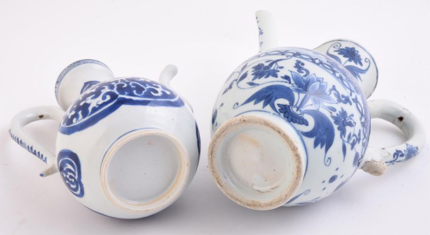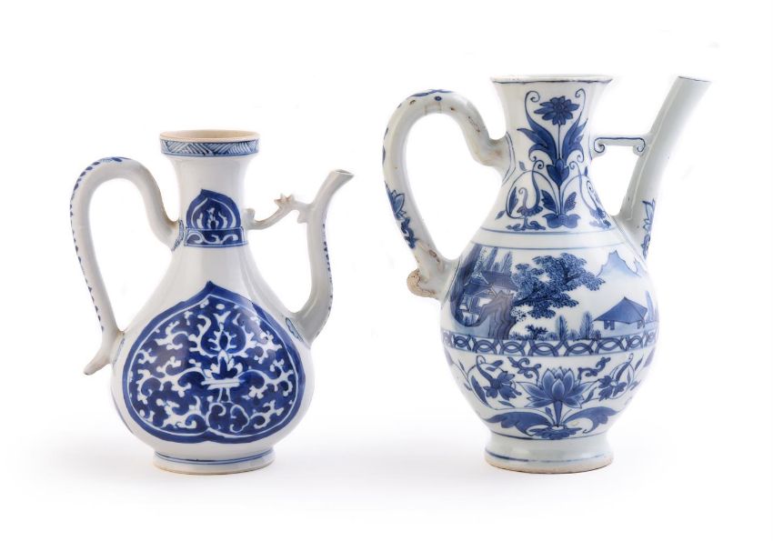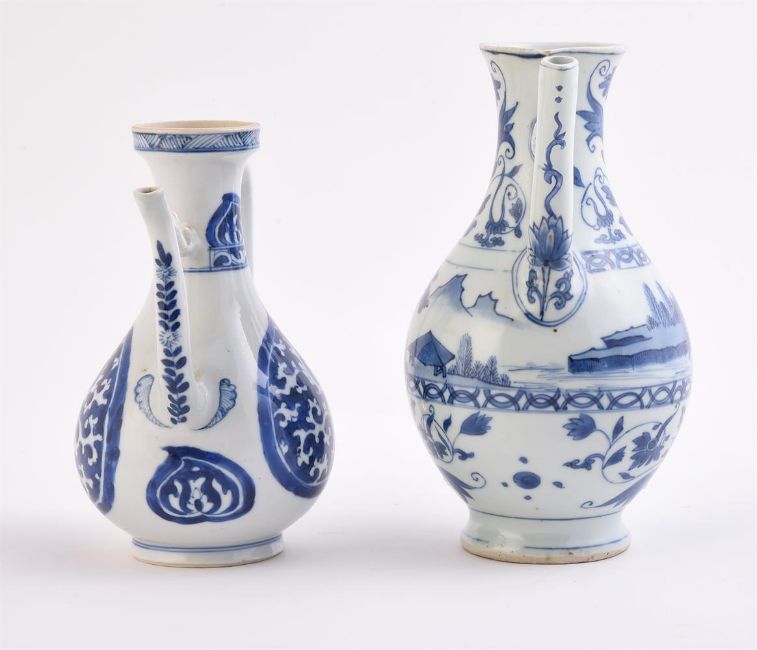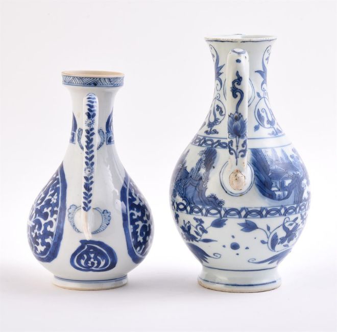 Two blue and white ewers, 17th century, 20.3cm high and 17cm high (2) 明 青花持壶两件 Condition Report: the larger jug with restoration to the spout and the bridge connecting spout to neck and also glaze loss to terminal of handle and other minor glaze losses and blemishes the other with restoration to tip of spout with sprayed area about 2cm long Condition Report Disclaimer