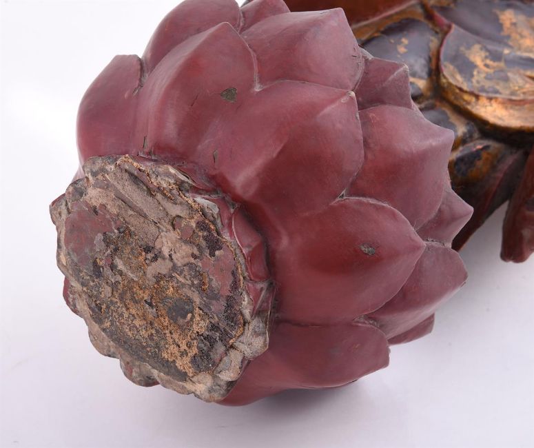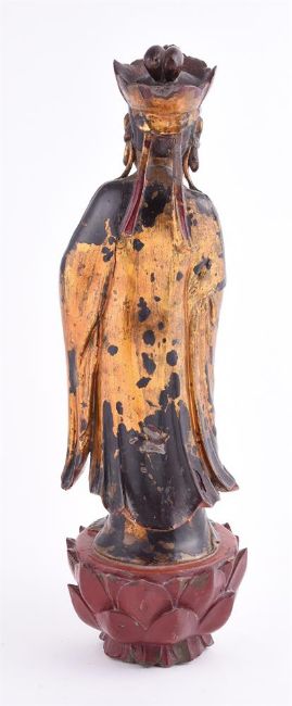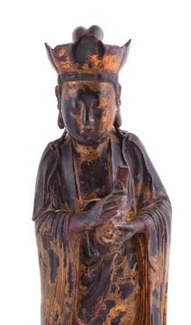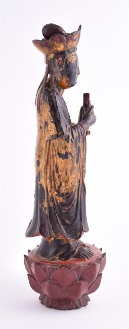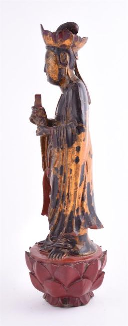 A Chinese carved wooden temple figure of Guanyin, on lotus base, the whole covered in red lacquer and gilding, 58.5cm highProvenance: Private London collection. 木雕观音像拍品来源:伦敦私人收藏Condition Report: some wear to gilding and flaking to lacquer and cracked in base 15cm long and left shoulder area downwards 20cm long Condition Report Disclaimer