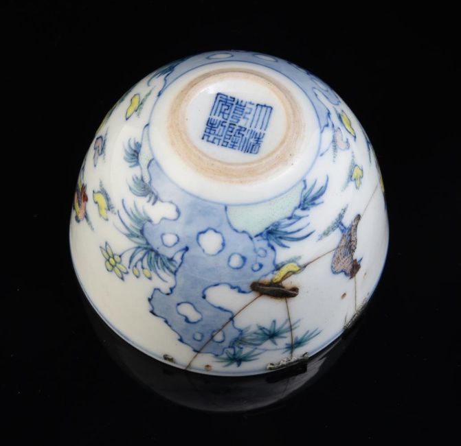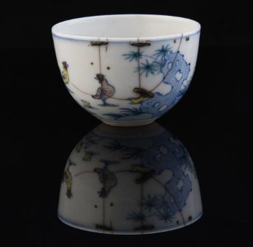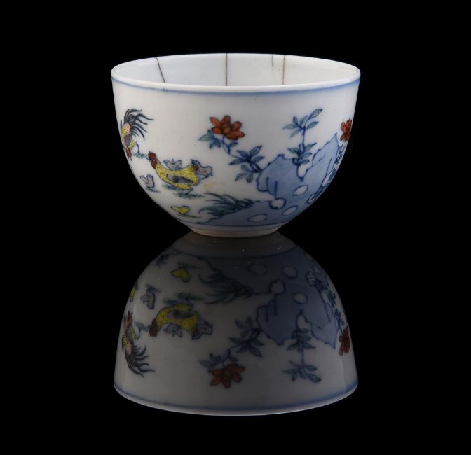 A Chinese Doucai 'chicken' cup, based on the Chenghua prototype, with steep rounded sides rising from a recessed base, finely decorated around the exterior with two cockerels and hens tending their four small chicks, divided on one side by blossoming peony issuing from rockwork and on the other by bamboo issuing from rockwork, all between a single line at the base and rim, the base with Qianlong six-character minyao mark in underglaze blue and possibly of the period, 6.2cm high x 4cm high Provenance: By repute purchased by the current owner in a French market many years ago.斗彩"大清乾隆年制"款鸡缸杯拍品来源:现藏家购自法国古董市场Condition Report: riveted repairCondition Report Disclaimer