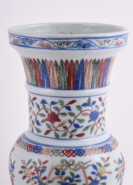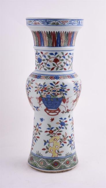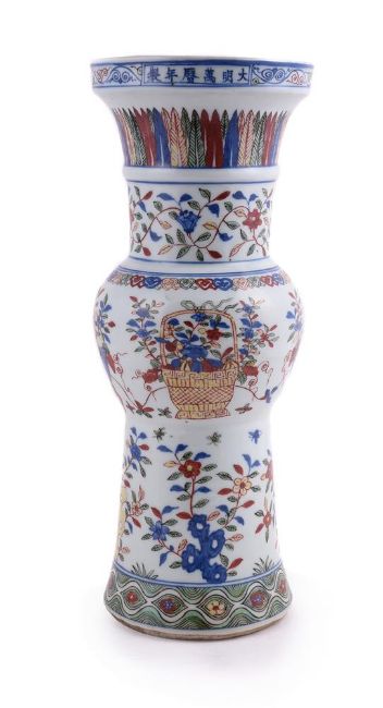 A Chinese Wucai vase, gu, painted in underglaze blue and coloured enamels with panels of flowers, foliage with the rim border enclosing apocryphal six-character Wanli mark in underglaze blue, 42cm high "大明万历年制"五彩花卉图花觚Condition Report: cracks through base and one cracks 25cm overall running through base and then 11cm up body f vase bisecting into two cracks and other cracks running through base and coming up about 2cm on each side into vaseCondition Report Disclaimer
