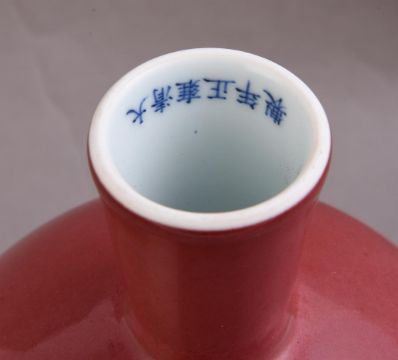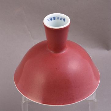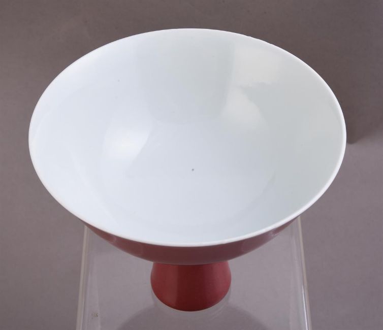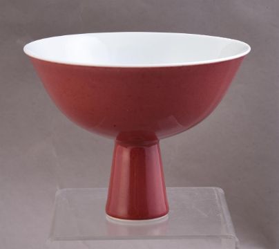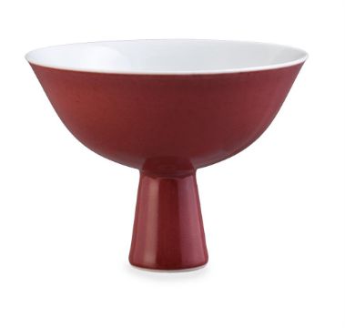 A Chinese copper-red glazed stem bowl, with deep rounded sides rising from high spreading stem to a wide flaring rim, covered on the exterior with crushed strawberry glaze stopping neatly around the foot rim, the interiors of the bowls and stems glazed, apocryphal Yongzheng six-character mark in underglaze blue, approximately 12m high x 15.4cm diameter红釉雍正款高足杯 Condition Report: in good condition Condition Report Disclaimer