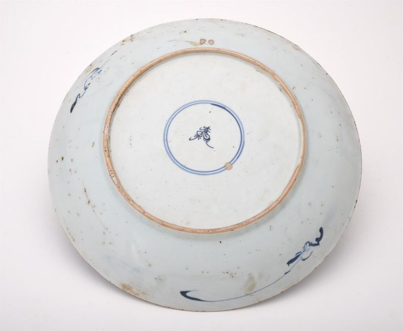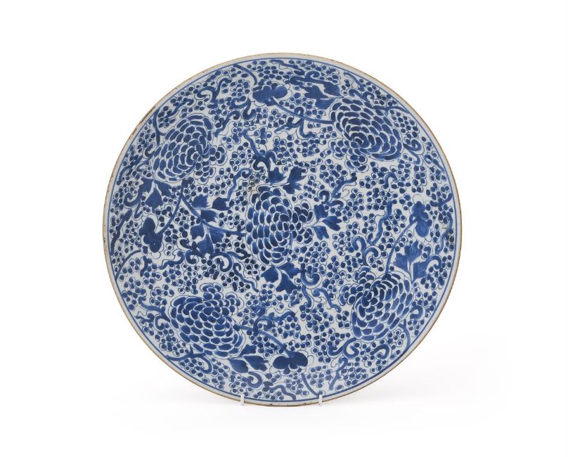 A Chinese blue and white charger, Kangxi, painted with peonies and foliage, 35cm diameter清康熙 青花大盘 Condition Report: minor fritting otherwise in good condition Condition Report Disclaimer