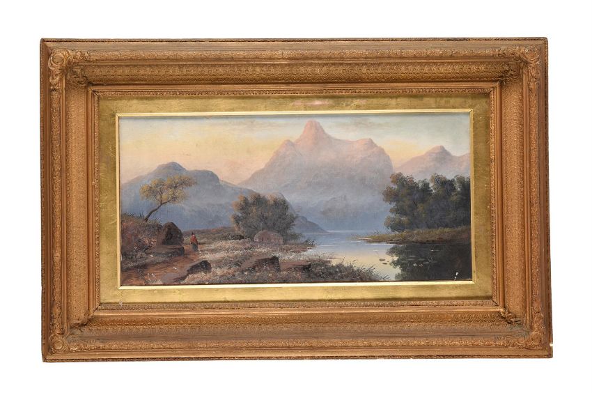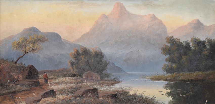 Attributed to Valentine Delawarr (Australian 1852-1918)Sunrise over the [?] mountains as seen from Ambleside, Tasmania Oil on canvas Signed (lower right) inscribed with title to label (verso)30.5 x 61cm (12 x 24 in.)Condition Report: Yellowing varnish and light surface dirt causing discolouration throughout. Rubbing tot he framing edges. Three areas of loss, the first to the upper edge with some associated flaking. A very small loss to the lower right quadrant in the trees. The final loss to the lower right corner. Inspection under UV reveals no obvious evidence of restoration or repair.Condition Report Disclaimer