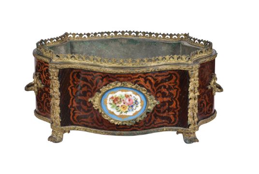 Y A French kingwood and tulipwood marquetry jardinière, circa 1870, with Sevres style porcelain plaques and gilt metal mounted through out, and with removable liner, 18cm high, 41cm wide overall, 27cm deep