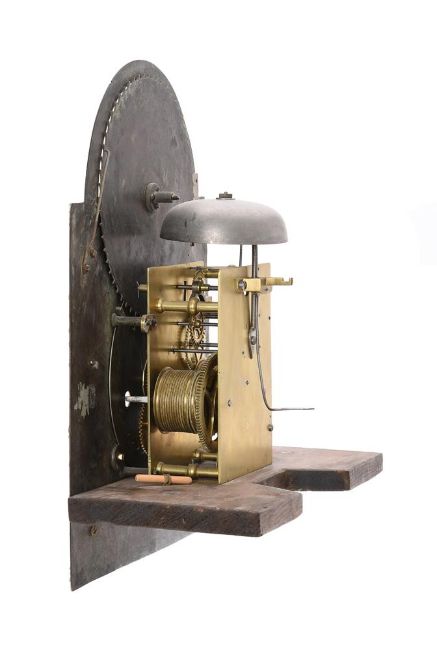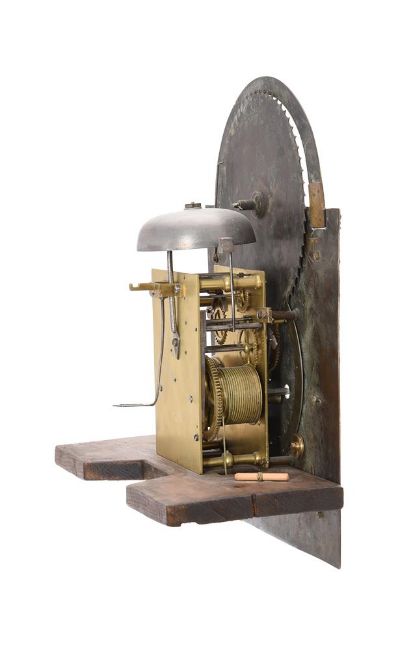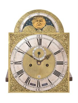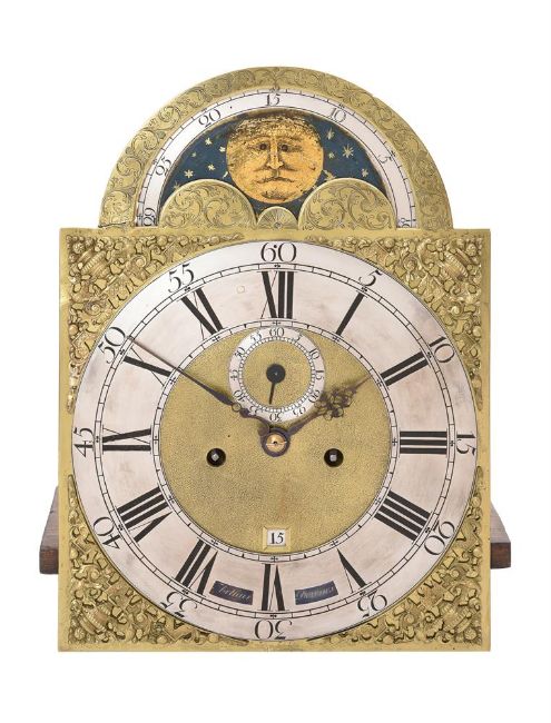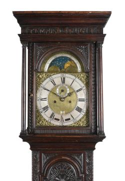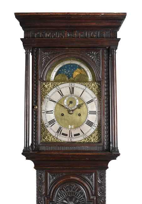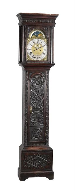 A carved oak longcase clock, with eight-day bell striking movement, the 12inch arched brass dial with applied spandrels to the angles and with moon phase automaton to the arch, the Roman numeral chapter ring bearing inscription for Arthur Downes and with subsidiary seconds dial, the case heavily carved, 225cm highProvenance: From the collection of the late Selwyn Demmy