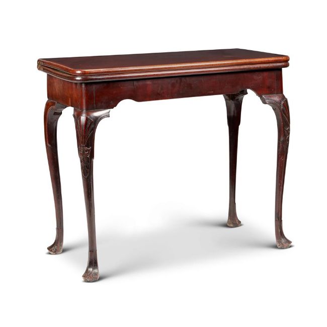 An Irish George II mahogany tea table, circa 1750, the rounded rectangular top above a shaped apron, on cabriole legs with shell-carved knees and webbed pad feet, 75cm high, 88cm wide, 41cm deepCondition Report: Marks, scratches, chips, splits and abrasions consistent with age and useThe folding top bowed; some use of filler to top.Feet later / later elements to feetSome marks to the top of one leg suggesting refixing?Evidence of old wormPlease refer to additional images for visual reference to condition  Condition Report Disclaimer