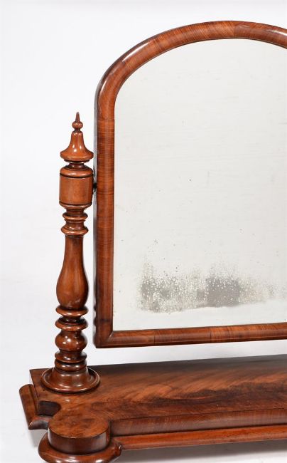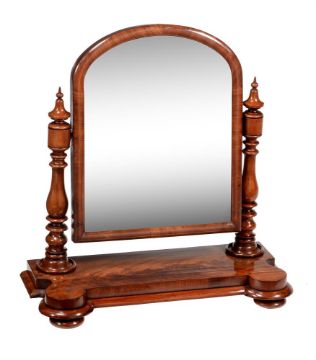 A Victorian mahogany dressing mirror, mid 19th century, the arched plate on turned supports, 71cm high, 69cm wide, 29cm deep
