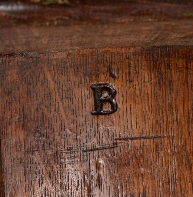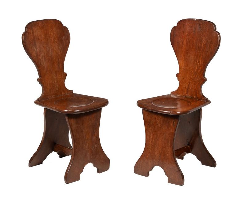 A pair of George II oak sgabello hall chairs, circa 1740, each with a stamped 'B' to the rear, each 96cm high