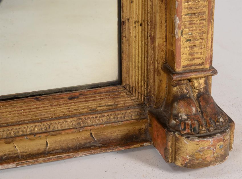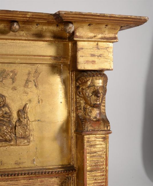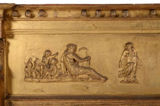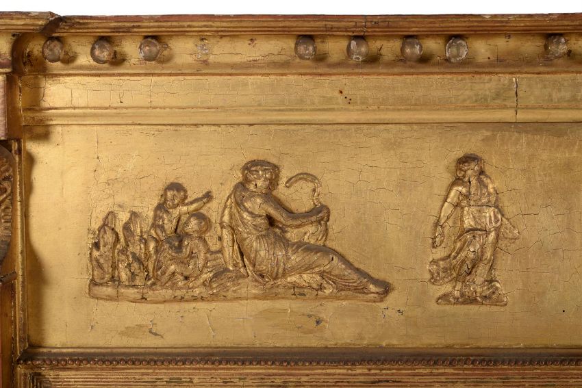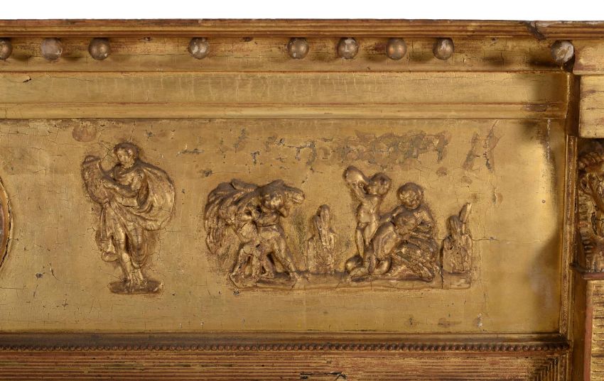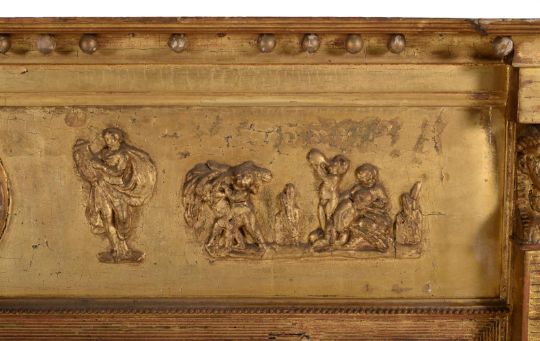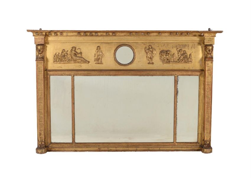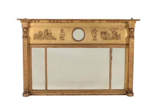 A late George III giltwood and composition overmantel wall mirror, circa 1810, the frieze with figural scene flanking a small convex plate above the triptych plates, 93cm high, 143cm wide