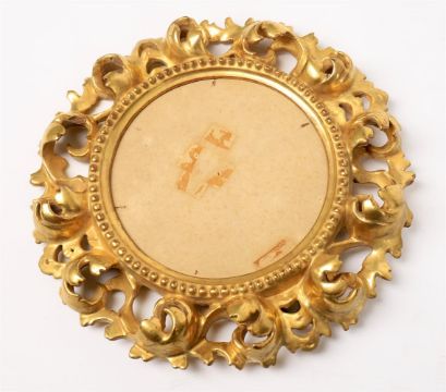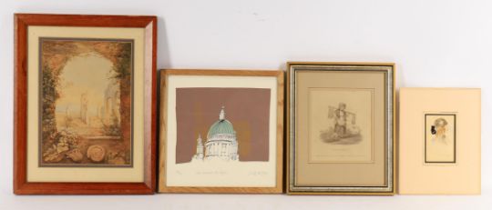Assorted pictures to include late 19th century watercolour 'View of the ruins of the Palace of the Caesars', 25.5 by 18cm; a Florentine style carved giltwood empty frame, 25.5cm diam., a small watercolour sketch of a young woman titled 'Rosalind'; modern oil of a kneeling nude by MA and assorted prints and watercolours (quantity)
