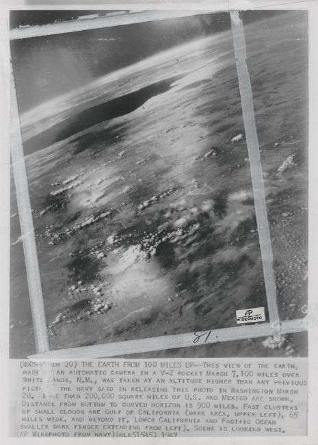 The first photograph taken from 100 miles up in space by an automatic camera installed on V2 launched from White Sands Proving Ground, New Mexico, released by the NAVY on the 20 March 19477 March 1947Vintage gelatin silver print on fibre-based paper, 18 x 25. 3 cm (7 x 10 in), a press photograph with Associated Press Wirephoto logo and cropping marks on the recto, press notes and date stamps on the verso, dating the print 21 March 1947Footnotes:'More than 200 square miles of the US and Mexico are shown. Distance from bottom to curved horizon is 900 miles. Past clusters of small clouds are Gulf of California (dark area, upper left), 65 miles wide, and beyond it, Lower California and Pacific Ocean (smaller dark fingers extending from left). Scene is looking west.' (AP Wirephoto caption)Condition Report: Recto: cropping marks applied with white marker (or concealer), Wirephoto sticker attached to front, surface cracks to emulsion, '81' annotated on the cropping frame in pencil. Verso: pencil annotations and cropping notes, archival date stamps (dating the print to March 1947)Condition Report Disclaimer