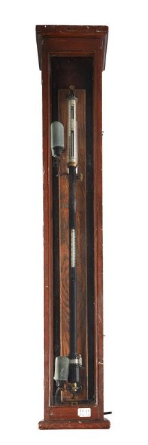 A CASED JAPANNED AND LACQUERED BRASS FORTIN-PATTERN LABORATORY/STATION MERCURY STICK BAROMETERJ.W. TOWERS AND COMPANY LIMITED, MANCHESTER, EARLY TO MID 20th CENTURYThe instrument with slender cylindrical case with the upper section fitted with a glass sleeve enclosing silvered scale incorporating vertical slot to reveal the tube and sliding silvered Vernier slide reading against silvered scale calibrated in barometric inches to the right and millibars to the left, the upper margin with Met Office number 5483, over signature J.W. TOWERS & Co. LTD, MANCHESTER to lower margin, the shaft with Vernier adjustment disc to right above applied mercury CENTS and FAH'T scale thermometer, the base with cylindrical glass chamber clamped between horizontal plates over cylindrical cistern and adjustment screw to base, mounted via hook for the top ring and screw clamp at the base onto a rectangular oak backboard into a pine framed case with full-height glazed front door and side windows, (unrestored).The cabinet 123cm (48.5ins) high, 21.5cm (8.5ins) wide, 20cm (8ins) deep. Provenance: The archive collection of Barometer World Museum, Merton, Devon. J.W. Towers and Company Limited are recorded in Banfield, Edwin BAROMETER MAKERS & RETAILERS 1660-1900 as working in Widnes and Manchester circa 1880-1900.The current lot is made to the principles laid down by Nicholas Fortin (1750-1831) and incorporates a glazed cistern so that the level can be calibrated via the adjustment screw to the base against an inverted conical ivory cone in the cistern in order to obtain consistency in the readings.