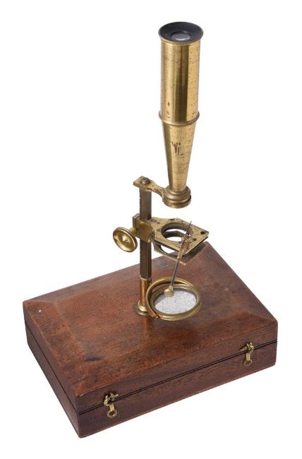 A GOULD-TYPE LACQUERED BRASS PORTABLE COMPOUND MICROSCOPECARPENTER, LONDON, SECOND QUARTER OF THE 19th CENTURYThe part-tapered tube screw-fitting at the objective end into a threaded collar positioned at the top of a square section upright cut with teeth for the rack and pinion up/down adjustment of the stage and signed Carpenter 24 Regent St. London, the platform fitted with sprung brass object retaining plate with pivoted plano-concave mirror applied beneath, the whole mounted via a threaded recessed collar onto the lid of the fitted mahogany box containing accessories including forceps, four objectives, three bone sliders, glazed specimen dish and condenser lens.28.5cm (11.25ins) high assembled; the box 16.5cm (6.5ins) wide, 11.5cm (4.5ins) deep. Philip Carpenter is recorded in Clifton, Gloria Directory of British Scientific Instrument Makers 1550-1851 as working from Inge Street then Bath Row, Birmingham 1808-22 before moving to London and setting up at 'The Microcosm' at 24 Regent Street in 1826 where he continued selling microscopes, Kaleidoscopes and related instruments (which were made at his workshops in Birmingham) until his death in 1833. He was succeeded by his wife, Mary who continued until 1837.The design of the current lot was devised by William Cary during the early 1820's and was subsequently published by his former apprentice, Charles Gould, in his 1827 publication THE COMPANION TO THE MICROSCOPE.