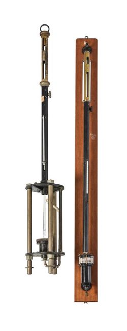 TWO LACQUERED BRASS AND BLACK JAPANNED STATION/LABORATORY MERCURY STICK BAROMETERSBOTH BY CASELLA, LONDON, EARLY 20th CENTURYThe first a rare bench barometer with ring over cylindrical silvered scale with vertical slot to reveal the tube and sliding silvered Vernier slide reading against millibar scale to the right opposing signature CASELLA, LONDON with Met Office monogram MO and numbered 2205 over shaft with Vernier adjustment disc to right and applied mercury tube Centigrade scale thermometer with concealed bulb, the base with disc applied with X and Y positioned spirit levels and over cage of three uprights around the stepped cylindrical cistern applied to a second conforming lower disc with the tube passing to one side and looped into the base of the cistern, on three fine screw adjusting feet; the second of standard Fortin pattern with similar cylindrical brass Vernier scale this time calibrated in barometric inches and signed C.F. CASELLA & Co. LTD, LONDON, No. 2349 to left hand margin, the shaft with Vernier adjustment screw and Fahrenheit scale mercury thermometer over base with cylindrical glass chamber clamped between horizontal plates over cylindrical cistern and adjustment screw to base, mounted via hook for the top ring bracket at the base to a mahogany panel for wall hanging, (both unrestored), (2).The bench barometer 103cm (40.5ins) high, 15cm (6ins) diameter; the Fortin 109cm (43ins) high, 9.5cm (3.75ins) wide. Provenance: The archive collection of Barometer World Museum, Merton, Devon; the first acquired direct from the Meteorological Office. The firm of Casella is recorded in Banfield, Edwin BAROMETER MAKERS AND RETAILERS 1660-1900 as being established by Louis Casella in 1838 when he went into partnership with his father-in-law Caesar Tagliabue initially trading as Tagliabue & Casella from 23 Hatton Garden, London. His successor, Louis Pascal Casella worked from 1858 and expanded the business resulting in Casella becoming one of the largest makers of barometers and other instruments in England. Charles Frederick Casella succeeded his father, Louis Pascal, in 1897; the business subsequently became a Limited Company in 1910 and continued trading well into the 20th century. The second barometer in the current lot is made to the principles laid down by Nicholas Fortin (1750-1831) and incorporates a glazed cistern so that the level can be calibrated via the adjustment screw to the base against an inverted conical ivory cone in the cistern in order to obtain consistency in the readings.