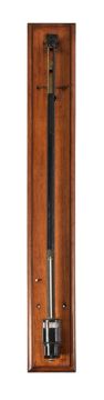AN EARLY JAPANNED AND LACQUERED BRASS FORTIN-PATTERN LABORATORY/STATION MERCURY STICK BAROMETERHENRY BARROW AND COMPANY, LONDON, CIRCA 1850The slender cylindrical black japanned case with brass scale calibrated in barometric inches next to vertical slot revealing the tube and with Vernier slide over adjustment screw to right hand side, the shaft with engraved signature Henry Barrow & Co., 26 Oxenden St., London, 134 and the base with Fahrenheit scale mercury thermometer incorporating bulb contained within the cylindrical cistern beneath, incorporating glazed sleeve visible via slots cut in the outer casing and with level adjustment to underside, the instrument mounted via top and bottom brackets onto a moulded mahogany wall panel, (unrestored, lacking tube).The panel 106.5cm (42ins) high, 15cm (6ins) wide. Provenance: The archive collection of Barometer World Museum, Merton, Devon; acquired direct from the Meteorological Office. Henry Barrow and Company are recorded in Clifton, Gloria Directory of British Scientific Instrument Makers 1550-1851 as working from 26 Oxenden Street, Haymarket, London 1849-51. They were successors to Robinson and Barrow and were succeeded by Henry Barrow working alone up until 1864.The current lot is made to the principles laid down by Nicholas Fortin (1750-1831) and incorporates a glazed cistern so that the level can be calibrated via the adjustment screw to the base against an inverted conical ivory cone in the cistern in order to obtain consistency in the readings. This particular type of barometer provides an accurate reading hence was generally adopted for laboratory use throughout the 19th and early 20th centuries.