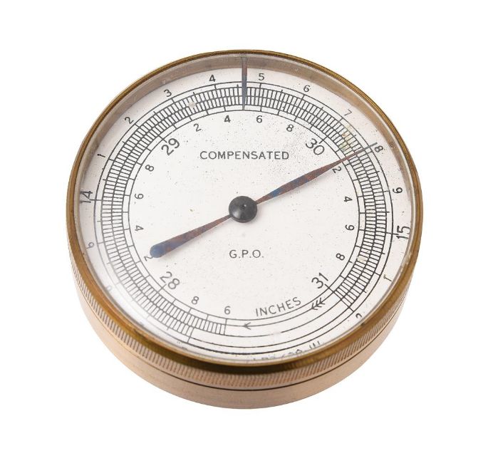 A SCARCE GENERAL POST OFFICE BRASS ANEROID BAROMETERUNSIGNED, EARLY 20th CENTURYThe 2.25 inch circular white register inscribed COMPENSATED, G.P.O. to centre within concentric scale calibrated in barometric inches divided into hundredths and outer LBS./SQ. IN from 13.6 to 15.2 also divided for hundredths, the glazed cylindrical lacquered brass case with internal steel recording pointer to the revolving bezel, in blue velvet lined faux red leather covered outer case.The barometer 6cm (2.375ins) diameter, 2cm (0.75ins) deep. Provenance: The exhibition collection of Barometer World Museum, Merton, Devon.