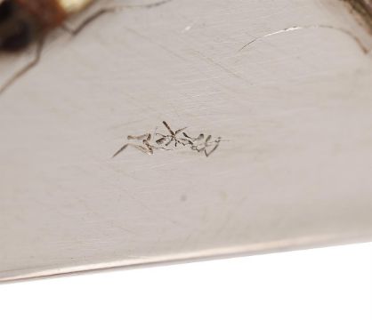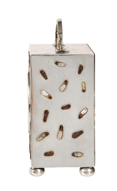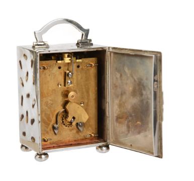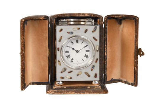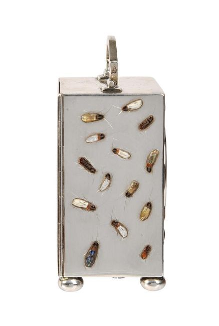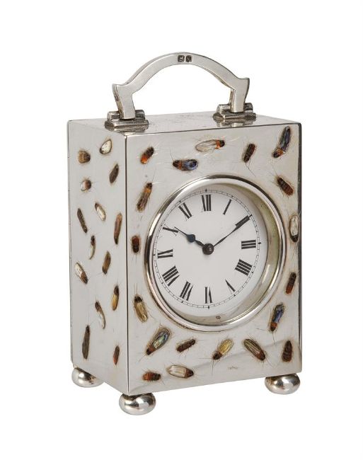 Y A RARE GEORGE V SHIBIYAMA INSECT DECORATED SILVER MINIATURE CARRIAGE TIMEPIECETHE CASE BY CHARLES AND RICHARD COMYNS, LONDON 1916The French rectangular eight-day single train movement with platform lever escapement and integral winder to backplate, the 1.5 inch circular white enamel Roman numeral dial with blued steel spade hands set behind a convex glass within moulded bezel incorporating canted insert to interior, the rectangular case with hinged arched carrying handle over front and sides inlaid in mother-of-pearl, amber, abalone and other materials with random crawling insects incorporating engraved legs and antennae and with very small Japanese character signature to lower right hand corner of the front panel, the rear with hinged door, on compressed bun feet, Hallmarks for London 1916 makers C&R C, with original Morocco covered protective outer case opening via hinged panels at the front.The clock 8.2cm (3.25ins) high with handle down, 5.6cm (2,25ins) wide, 4.5cm (1.75ins) deep. Provenance: Private collection, East Midlands. The Comyns family business of silversmiths was established by William Comyns who succeeded Richard Tagg in 1858. The firm initially traded form Soho but quickly expanded taking on premises in Beak Street off Regent Street. In 1885 William's two sons Charles and Richard joined the business who then succeeded their father on his death in 1916. Charles died in 1925 and the firm was incorporated as William Comyns and Sons Limited in 1930 before being bought by Richard Copping on Richards death in 1953. The Comyns family mainly specialised in producing small decorative wares for all price brackets often produced using mechanical methods such as die stamping. The execution of Shibiyama decoration of the current lot would have been undertaken by a specialist Japanese craftsman resulting in a highly unusual luxury product.Condition Report: Movement appears complete and fundamentally original except possibly for the platform escapement which may be a later 20th century replacement. The movement will wind and the escapement will beat but stops after a couple of seconds indicating service and adjustment is required. The dial appears free from any visible damage or restoration. The case is in fine original condition with no losses to the Shibiyama and next to no wear; faults are very much limited to a couple of tiny slight scuffs and scratches to the back door. The protective case is missing almost all of its silk lining to the interior; the exterior is generally intact but with bumps, scuffs and wear and is lacking loop carrying handle.Timepiece is complete with integral winding key. Condition Report Disclaimer