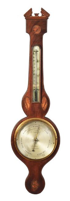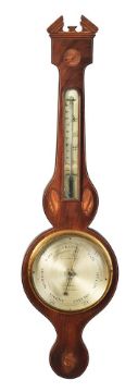 Y A REGENCY INLAID MAHOGANY MERCURY WHEEL BAROMETERG. KALABERGO, BANBURY, CIRCA 1815The 8 inch circular silvered register engraved with geometric rosette and signed G. Kalaberga, Banbury, Warranted to the centre within scale calibrated in barometric inches and with the usual weather observations to outer track, set behind glazed convex moulded cast brass bezel incorporating additional recording hand to the glass, the ebony and box edged case with open triangular pediment above inlaid shell roundel and arch-glazed Fahrenheit scale spirit tube thermometer flanked by further conch-shell decorated paterae to the baluster shaped upright, the rounded base further inlaid with a conforming roundel, (unrestored).98cm (38.5ins) high, 25cm (10ins) wide. Provenance: The reserve retail stock of Barometer World Museum, Merton, Devon. The story behind the maker of the current lot is particular interest from the point of view of social history. Giovanni Kalabergo arrived in Banbury from Italy in around 1810 and later anglicised his name to John. He was, in 1851, also joined by his nephew who shared his name but took to calling himself William. Unfortunately William did not take kindly to his uncle's demanding demeaner and he sought to address the problem by hatching a plan to murder him and inherit his property. In January 1852 William bought himself a gun and joined his uncle on a normal work-related trip out of town. Whilst descending d Williamscot Hill William drew the gun and shot his uncle. On returning to Banbury he reported to the Police that they had been set-upon by bandits and that his uncle resisted (allowing William to escape) but had been shot.On investigation the Police suspected foul play as nothing had been stolen from Giovanni and William was in possession of the murder weapon together with ammunition and a blood-stained rag. William was subsequently trialled and found guilty of his uncle's murder. Whilst in prison awaiting execution he made two attempts to escape; the infamy of his trial was reported throughout the country and resulted in around 10,000 people attending his hanging, a folk ballad also records his fate:In Italy I was bred and born,At Oxford town I must die with scorn;For murdering my uncle as you may see,Has brought me to the gallows tree.Condition Report: Tube has been removed but pulley mechanism is present; will require tube, lines and weights/floats. The dial has overall light to moderate oxidation to the silvering otherwise is in good original condition. The thermometer is intact but the glass to the housing is cracked/damaged. The silvering to the thermometer scale has some patchy oxidation. The case is in sound original condition with notable faults limited to bruising to the surface around the lower inlaid rosette, some light lifting to the side veneers and further light bruising/scuffs to the mouldings of the pediment. Faults are otherwise limited to minor bumps and scuff and the rear door is missing two securing screws for the upper hinge. Surface/finish is generally a little flat. Condition Report Disclaimer
