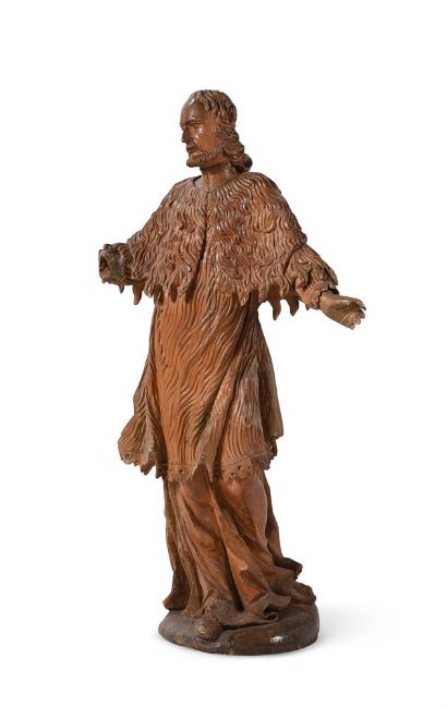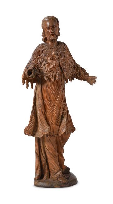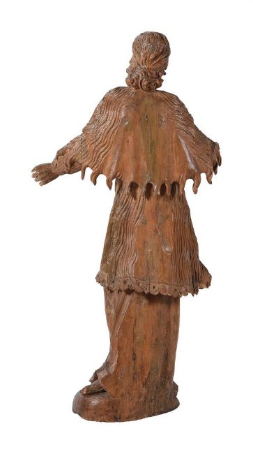 A CARVED LIMEWOOD FIGURE OF A STANDING APOSTOLIC FIGURE SWISS OR SOUTH GERMAN, 17TH CENTURY Depicted standing, arms outstretched, the coat of scrolling fur form93cm high, the base 28cm wideCondition Report: Restorations notably to head and right arm, righthand absent- left hand with lossesCondition Report Disclaimer