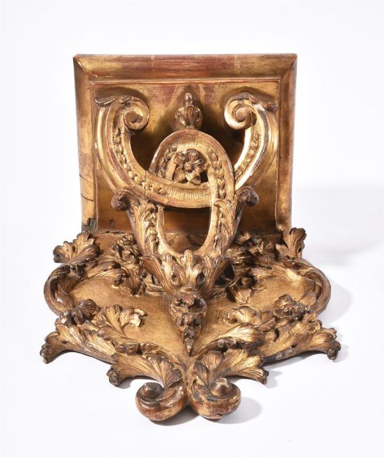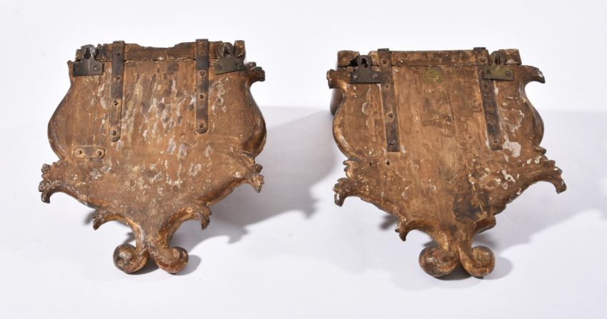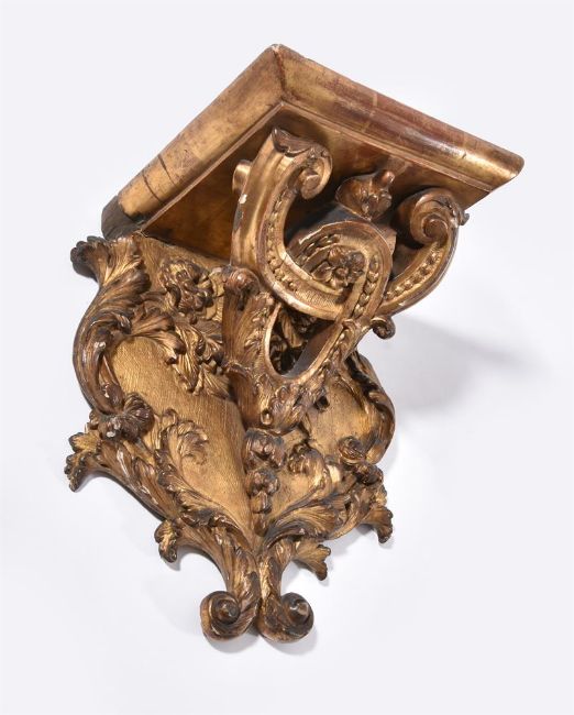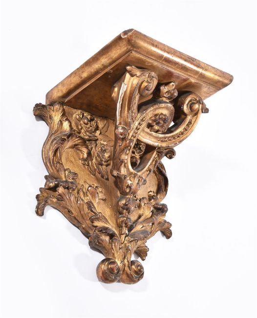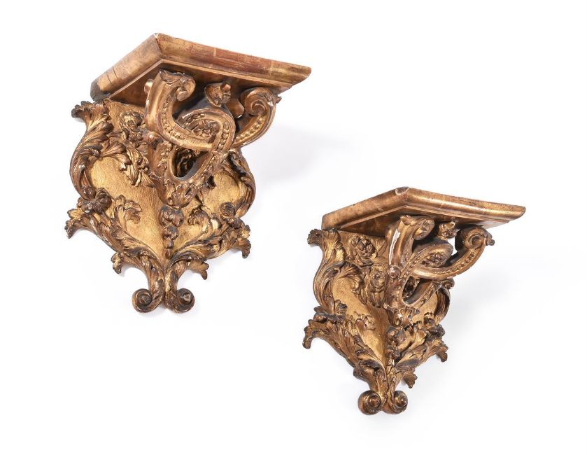 A PAIR OF CONTINENTAL CARVED GILTWOOD WALL BRACKETS IN THE MANNER OF JEAN PELLETIER, 18TH CENTURYeach 30cm high, 28cm wide, 21cm deep Provenance: Private collection removed from 9, Royal Crescent, Bath
