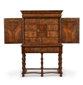 A WILLIAM & MARY BURR WALNUT CABINET ON STANDTHE CABINET CIRCA 1690, THE STAND LATERWith a cushion drawer, the doors enclosing eight drawers around a central door170cm high, 109cm wide, 52cm deep overallCondition Report: There are marks, scratches, knocks, chips, splits and abrasions consistent with age and use. There are some losses and replacements including the stand, sections of moulding to the cornice, crossbanded and other veneers, a central oak fillet to the right hand door and elsewhere.There are cracks to the doors, visible to the exterior and interior.The handles later and are matched.The locks later. There is one key which engages with the distinctive cruciform locks but does not turn either of the locks. The locks are open.The drawer linings are oak.The backboards are dark stained as is the back of the base. There is evidence of worm.Please see the additional photographs as a visual reference of condition. Condition Report Disclaimer