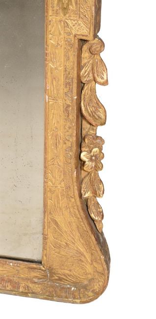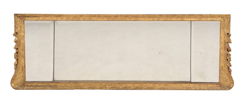 A GEORGE I GILTWOOD WALL MIRROR IN THE MANNER OF JAMES MOORE, CIRCA 1720With bevelled triptych mirror plate 48cm high, 142cm wide Condition Report: Marks, knocks, scratches, abrasions consistent with age and useThe rear boards have been later secured with black tape - this is an amateur repair and will require better securing before further installationSome wear, chips and losses to the gilt surface, some refreshingThe plates with some bloom and depletion, this are slightly loose in the framesThe hooks to the rear are replacements, there are various old holes where others have beenPlease refer to additional images for visual reference to conditionCondition Report Disclaimer