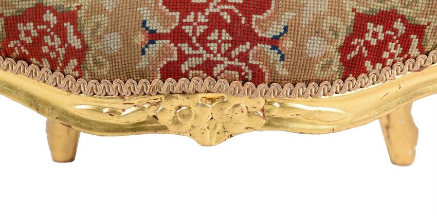 A SET OF SIX GEORGE III GILTWOOD AND TAPESTRY UPHOLSTERED ARMCHAIRSIN LOUIS XV STYLE, SECOND HALF 18TH CENTURYEach with shield shaped back above the seat and cabriole legs90cm high Provenance:Elibank House, Taplow- a Grade II Listed Queen Anne house Provenance: Mallett  Condition Report: All with marks, knocks, scratches, abrasions consistent with age and useOld splits and cracks, some chips and losses,the gilt surfaces variously rubbed, worn, chipped and with losses through to underlying bole, gesso and timber and also with signs of refreshing throughout. The elements of all frames with looseness, the upholstery is later; this is worn and fraying in places and also with losses. The rails with signs of woodworm. One chair with later bracing to a leg which has been disguised with gold paintPlease refer to additional images for visual reference to conditionEach approximately 89cm high, 61cm wide, 55cm deep Condition Report Disclaimer