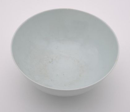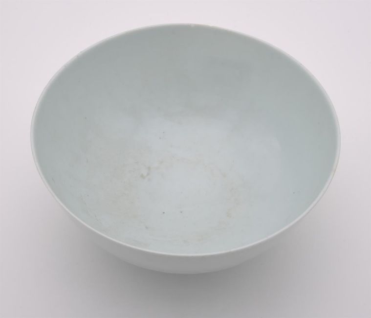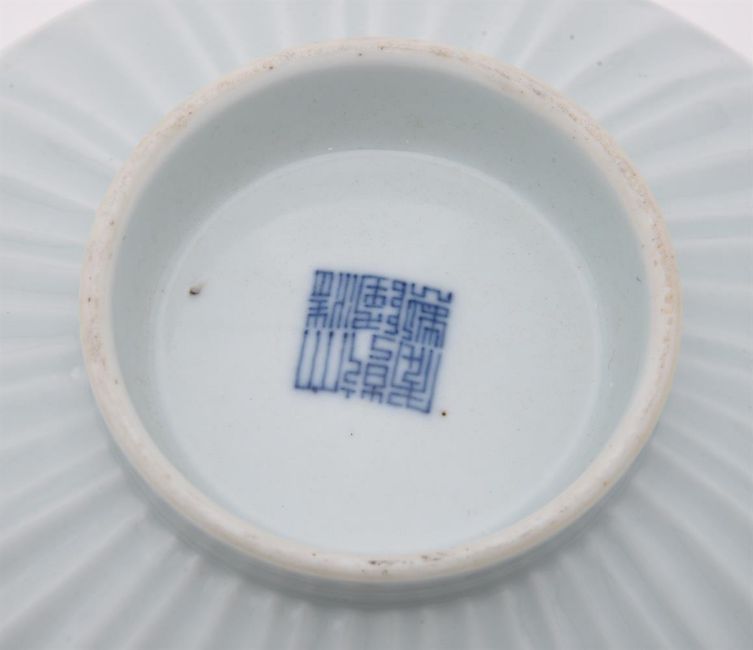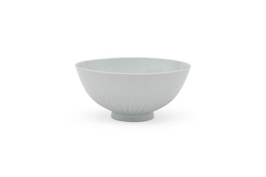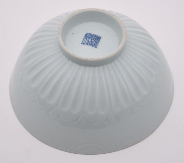 A Chinese white glazed 'Lotus' bowl, Qianlong mark and of the period (1736-1795), the deep rounded sides moulded with a band of overlapping petal tips blow and band of key-fret patterns to the rim, the base with a six-character qianlong mark in underglaze blue, 19.6cm diameter清乾隆 "大清乾隆年制"款白釉暗刻莲子碗Condition Report: one area of crack of 9.5cm x 6.5cm to the rim and three hairlines, two minute chips to the rimCondition Report Disclaimer