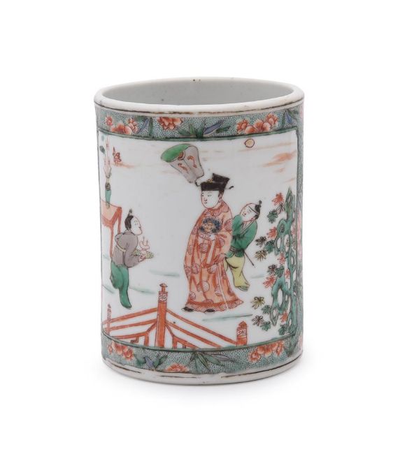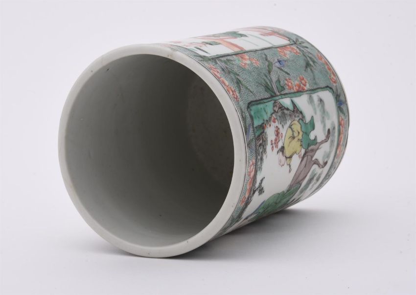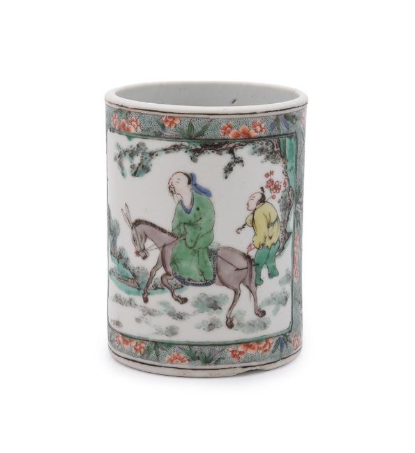 A Chinese Famille Verte cylindrical brush pot, Kangxi, painted on one side with a Daoist scholar on a mule, probably Zhang Guolao, and the other side with a scholar attended by acolytes, 12.9cm high x 9.8cm wide清康熙 五彩人物图笔筒Condition Report: two hair cracks one 12cm long and one 6cm long the edge of base with scale chip 3.5cm long x 1.9cm deepsurface wear commensurate with age firing cracks to baseCondition Report Disclaimer