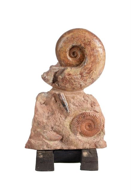 AN AMMONITE FOSSIL GROUPWith large specimen above the rock base with further partially excavated examples28.5cm high overall On a later stained wood H-shaped stand base32cm high overallProvenance: Property of Elizabeth Gage MBE